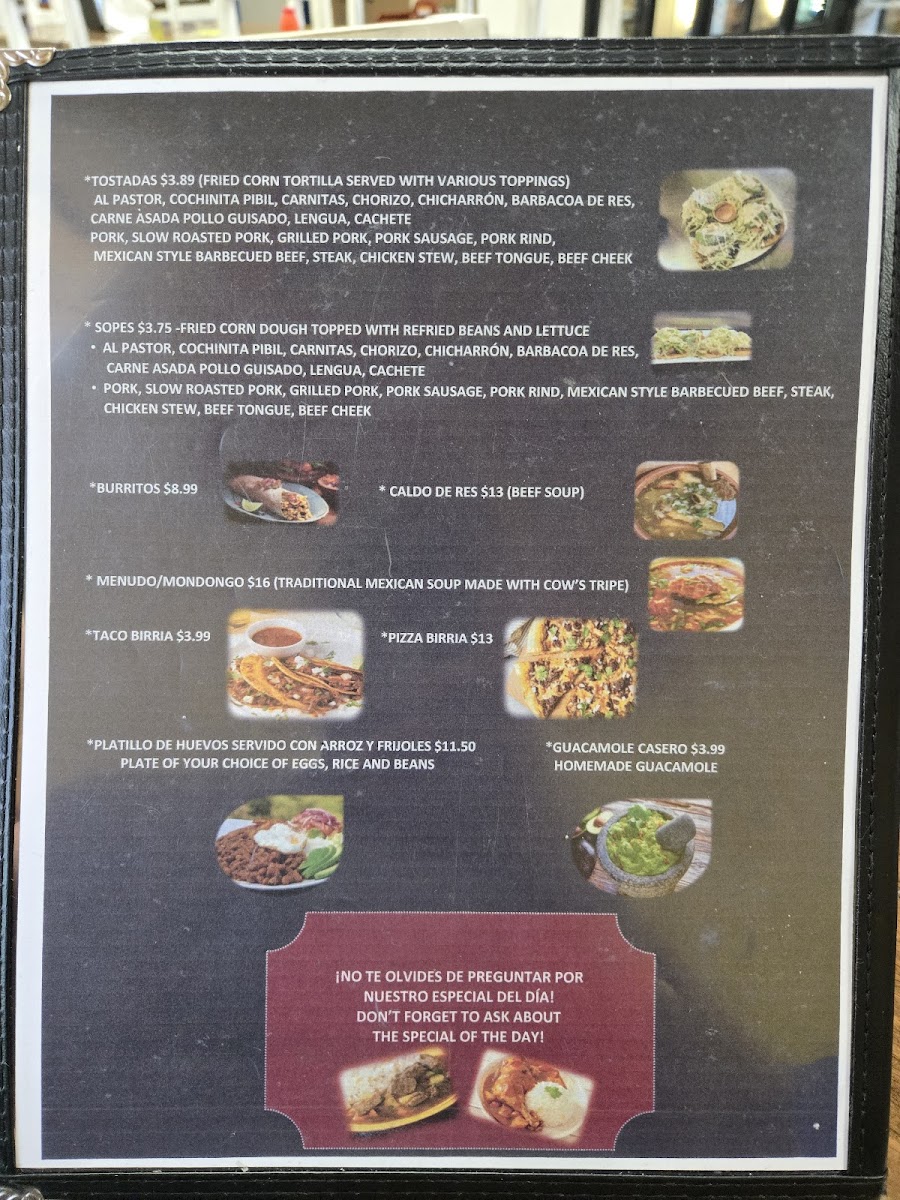 The menu features hearty options like Caldo De Res, a warming beef soup perfect for cooler days or when you’re craving something soothing. For those looking for classic flavors, items such as Carnitas and Chilaquiles Verdes—which often come served with eggs and steak—offer a taste of home-style cooking that pairs well with the friendly, unpretentious atmosphere.
